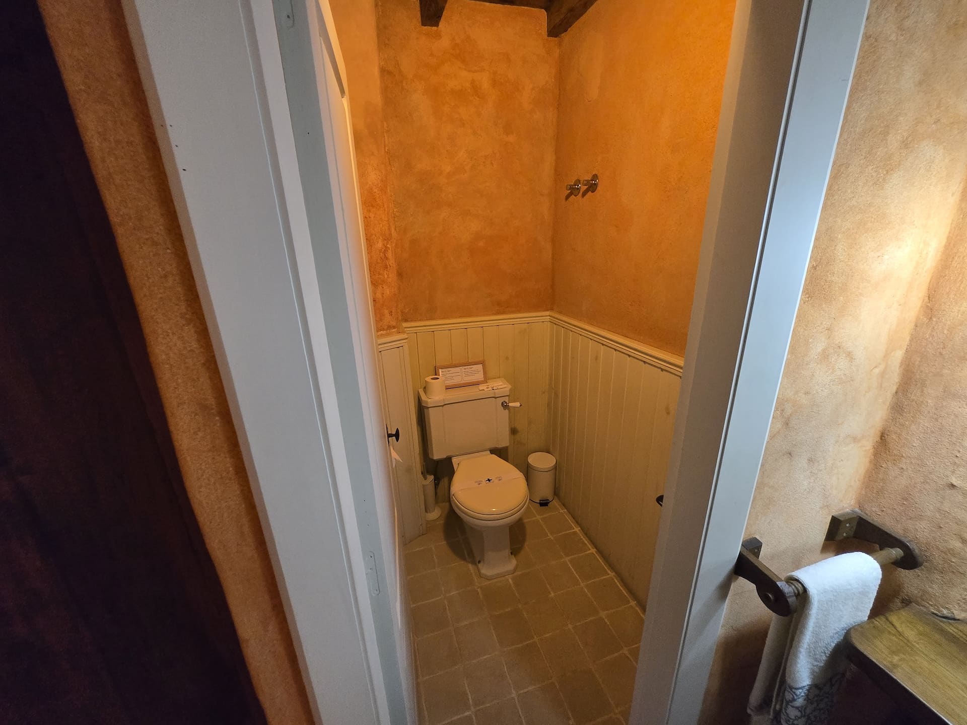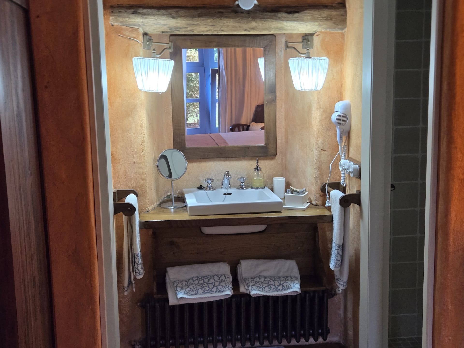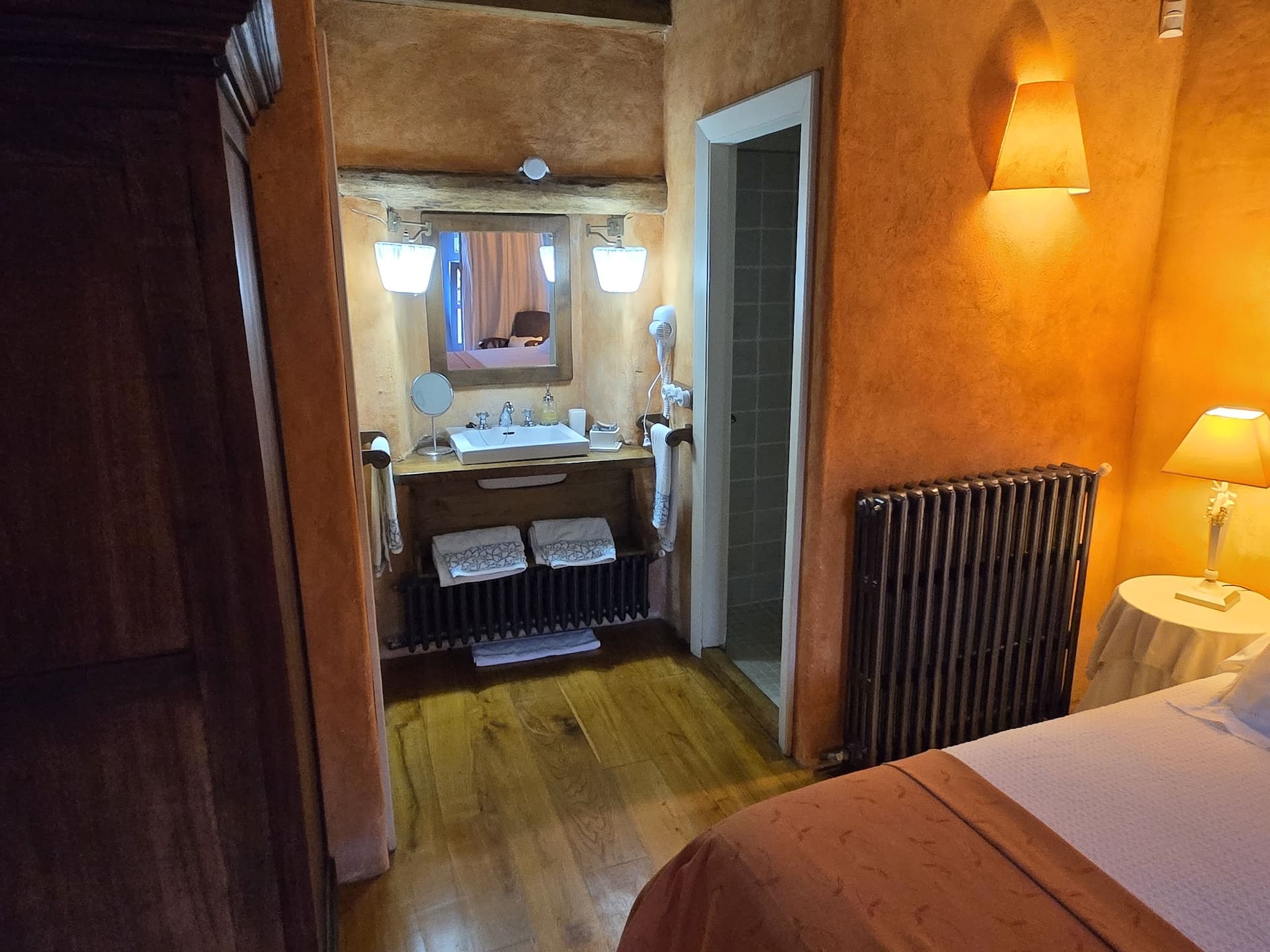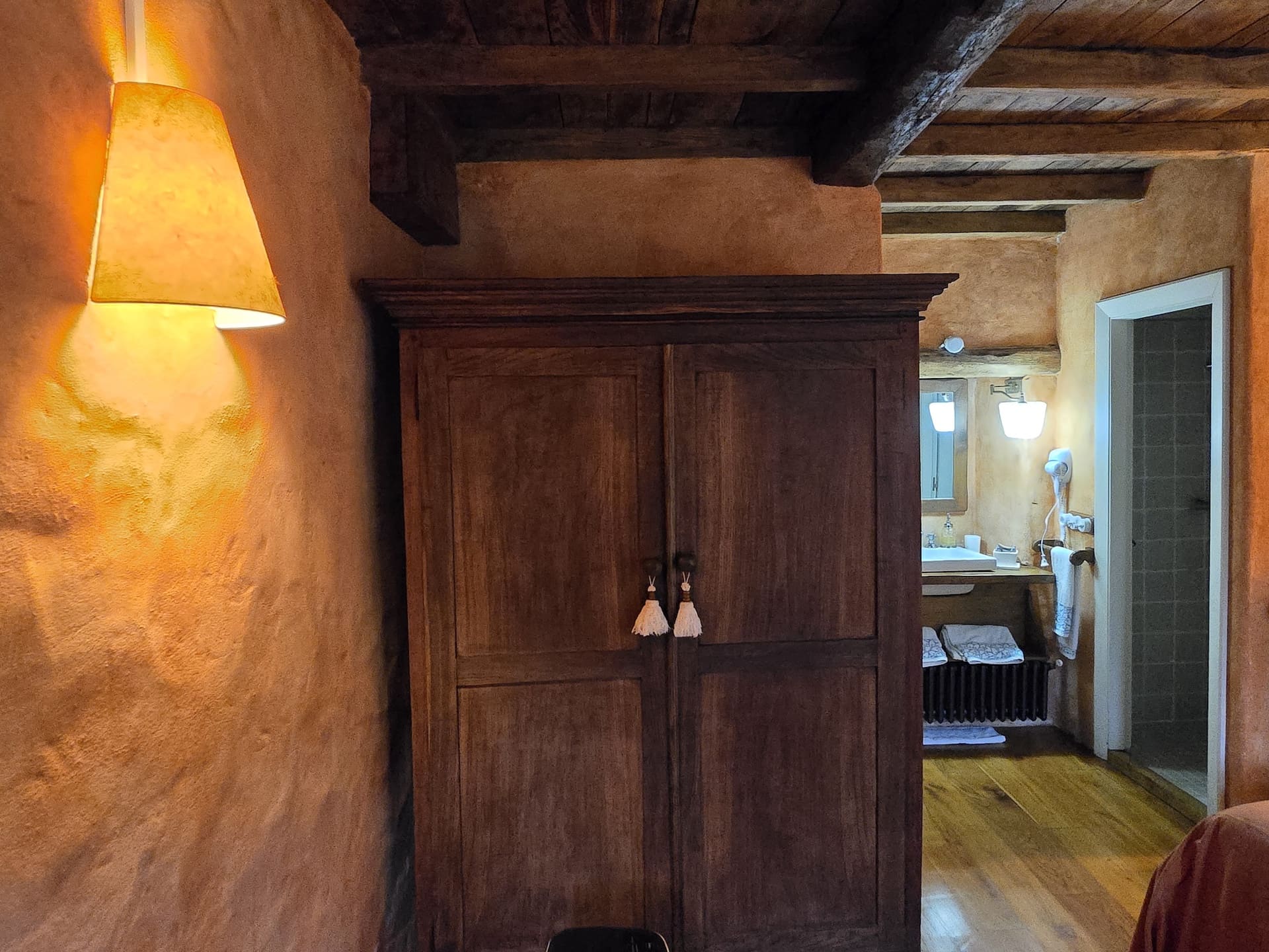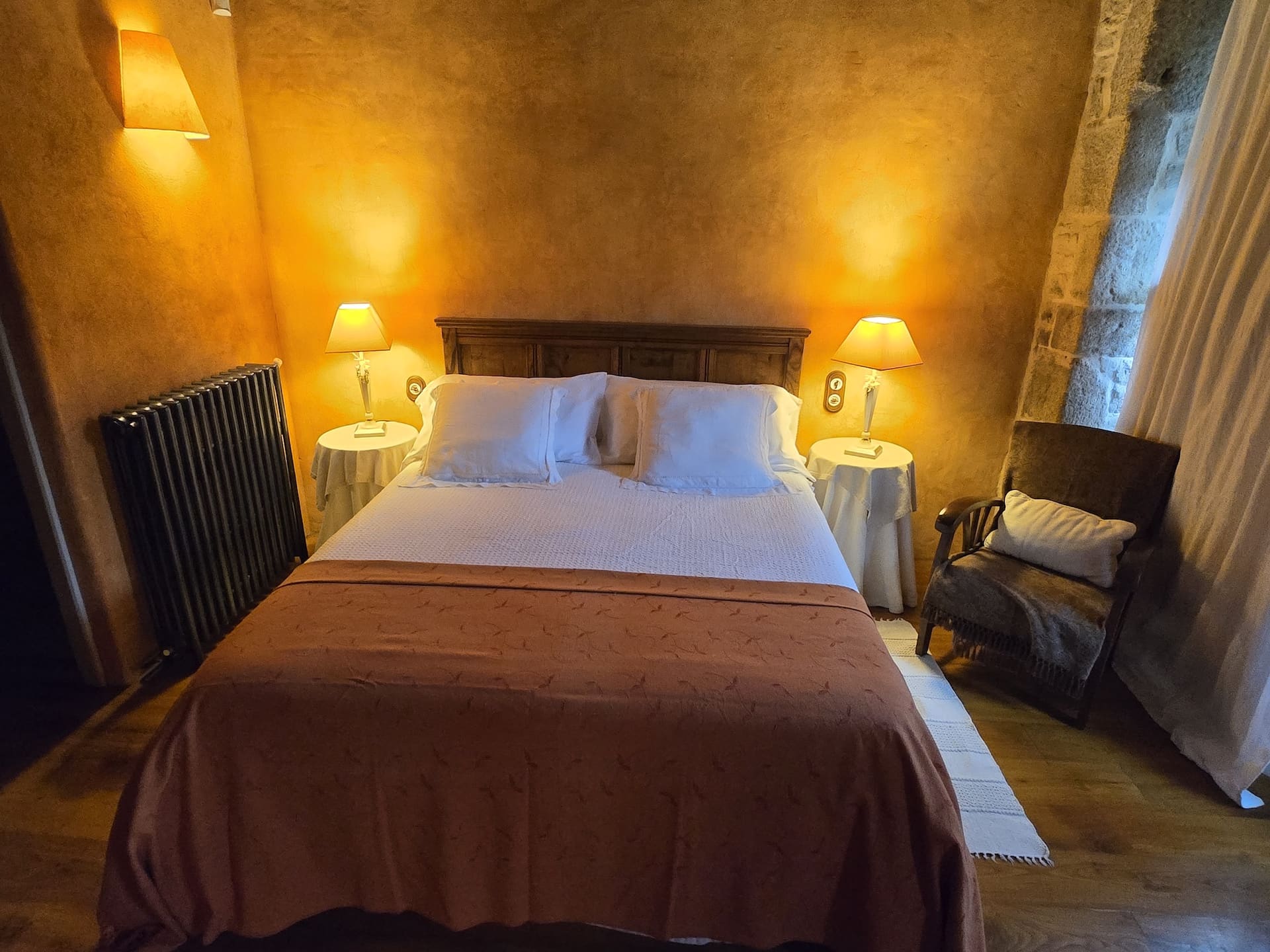 La Habitación Solpor es la huella de esos atardeceres. Sus muros dorados y cálidos guardan el resplandor del día que se apaga, mientras las lámparas encendidas imitan la suavidad del sol bajando lentamente tras los montes. La cama blanca y generosa es como un horizonte sereno donde reposar, y la madera antigua sostiene la estancia como la tierra sostiene el cielo en el último instante de luz.
