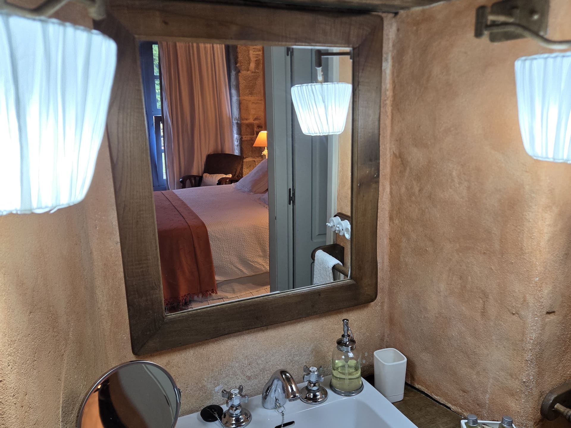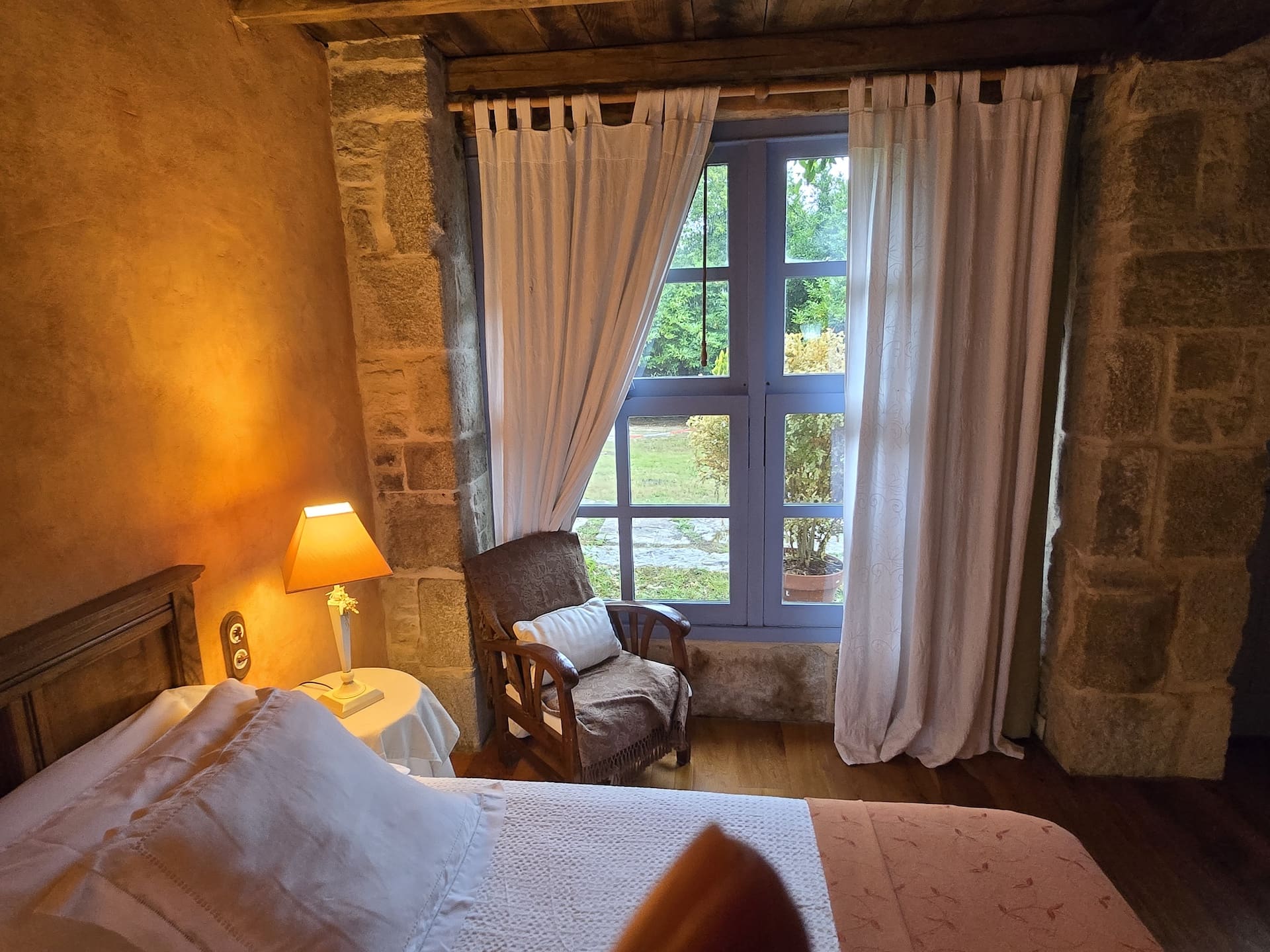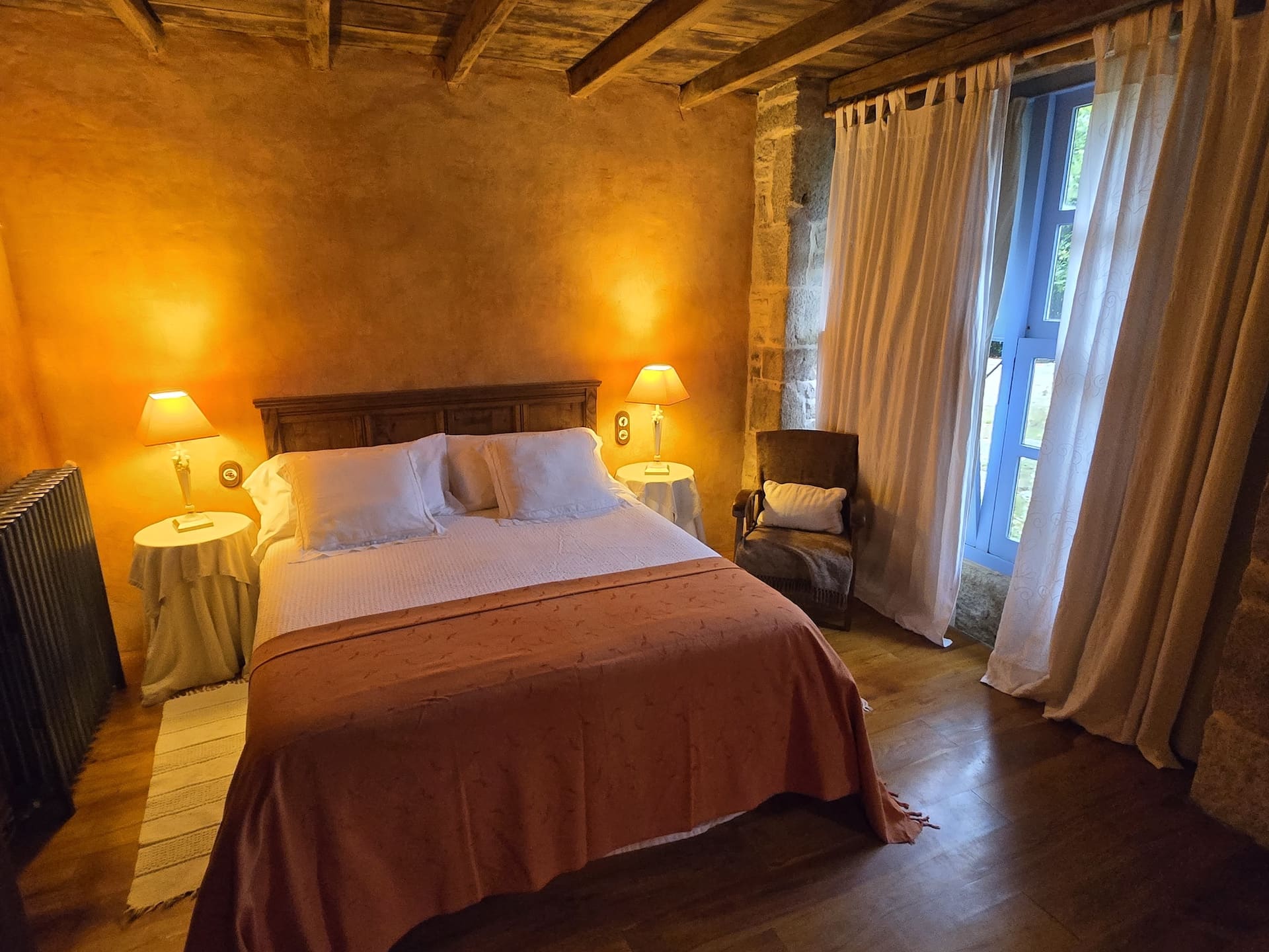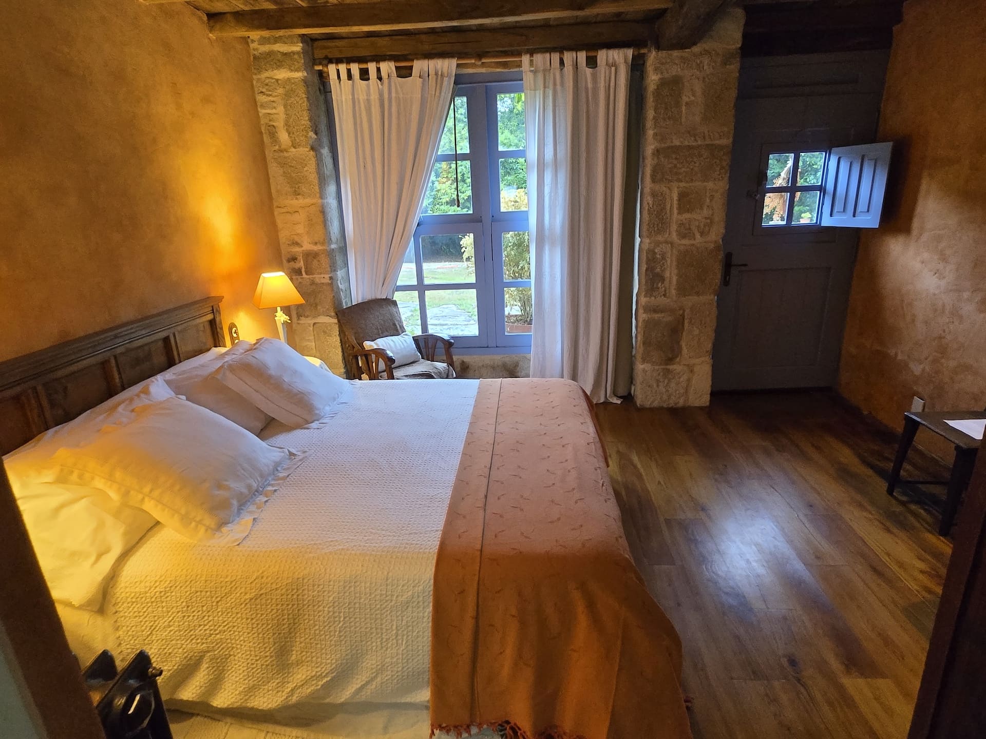 La habitación «Solpor» de Casa Castelo de Andrade es muy luminosa y acogedora. Destaca por sus grandes ventanales, por los que entra mucha luz. Además, las vistas a la finca son preciosas.